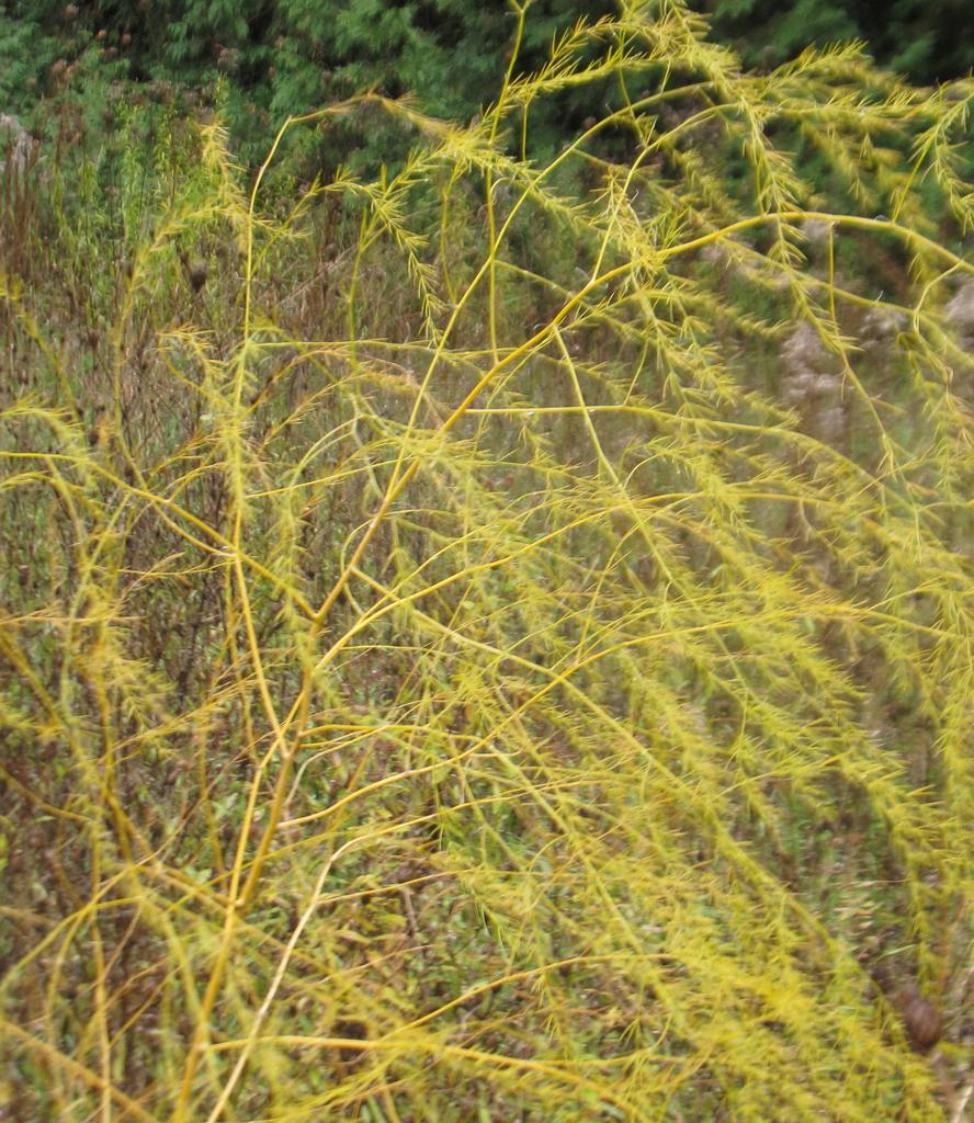 I always enjoy November, as it generally offers some wonderful colour transitions, in particular those of tamarack trees which really put on a show before dropping their ‘golden needles.’ In addition, I especially enjoy the lovely Paper (white) Birch trees whose trunks can gleam in the sunshine while their leaves of golden yellow are backed up by a blue sky. Much smaller are the Wild Asparagus plants I have discovered, with their delicate and feathery golden tresses, sometimes with bright red berries.
